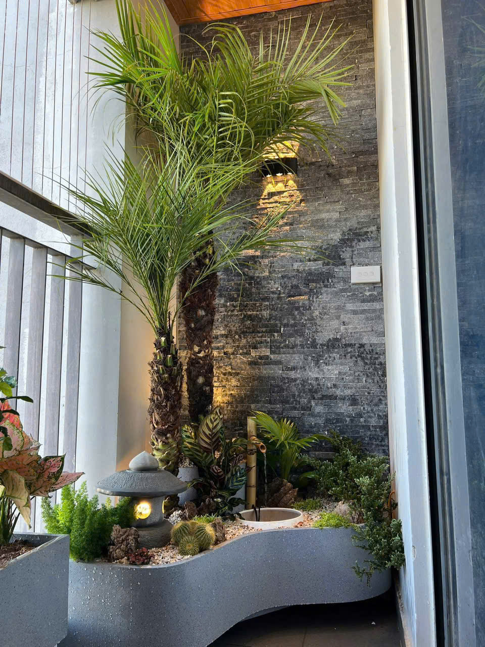 Kết hợp thêm cây xanh và mái che để bảo vệ tiểu cảnh, giữ nước không bốc hơi nhanh và đảm bảo độ bền.